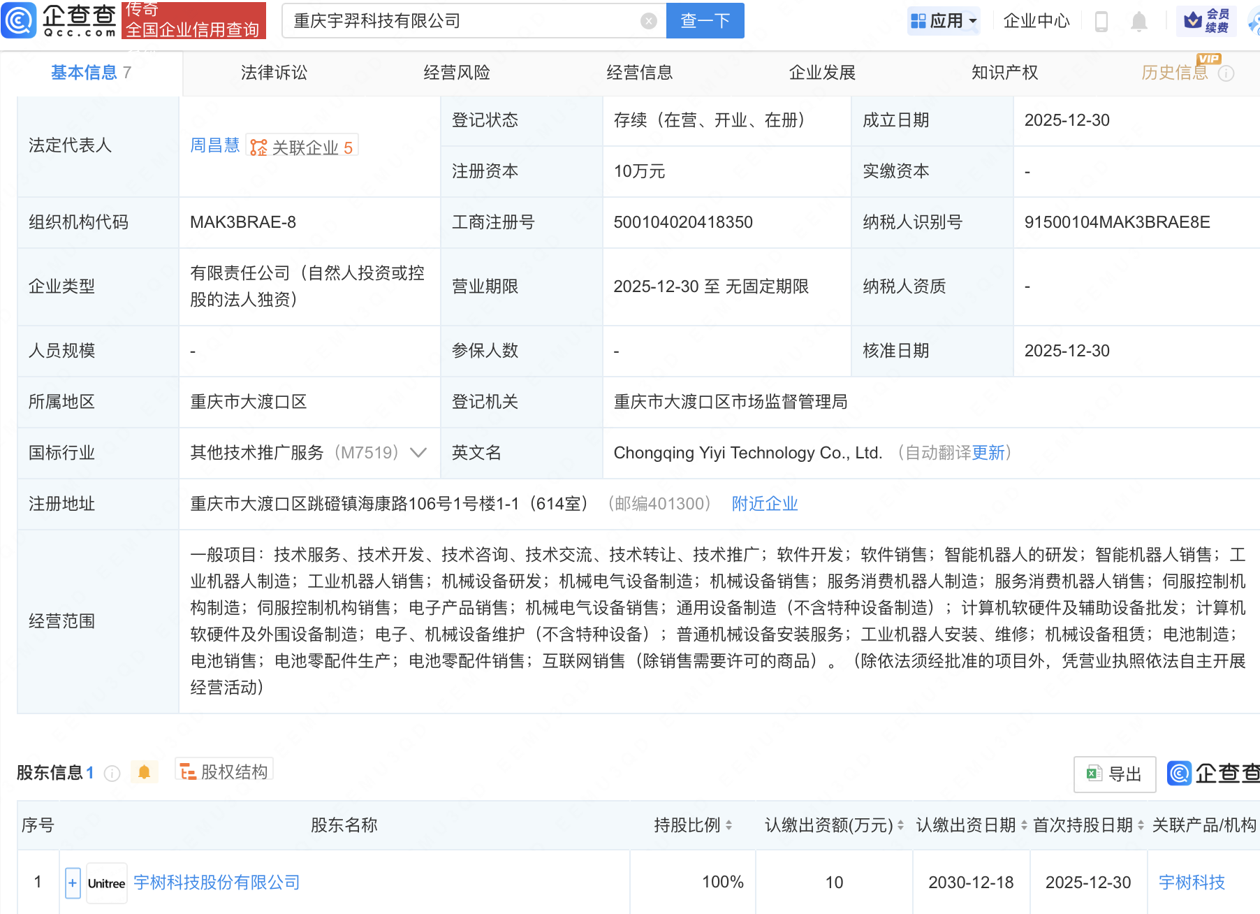 近日,重庆宇羿科技有限公司成立,经营范围包含:智能机器人的研发;智能机器人销售;工业机器人制造;工业机器人销售;机械设备研发等。企查查股权穿透显示,该公司由宇树科技股份有限公司全资持股。